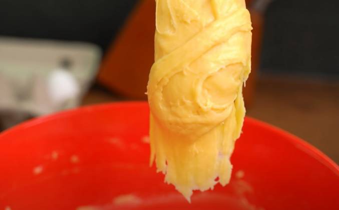 2. Для коржей: 100 г молока, 100 г воды, 80 г сливочного масла, вылить в кастрюлю, добавить 1/4 ч.л. соли, нагреть, добавить 120 г пшеничной муки и заварить, Переложить тесто в миску и дать остыть 3-4 минуты, добавить яйца по одному за раз, я добавила 3,5 крупных яйца, вот таким должно получится тесто, характерный язычок, тесто разделить на 2 части, выложить на пергамент или силиконовый коврик, размер 30 см на 40 см.