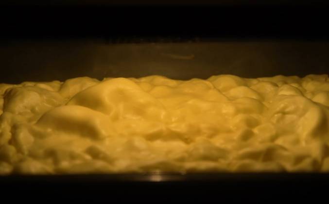 3. разровнять тесто, выпекать 10-12 минут при температуре 200 градусов Цельсия, вот такие 2 коржа, заварная основа для крема полностью остыла, 160 г сливочного масла комнатной температуры, взбить заварную основу 3-4 минуты, добавить по кусочку сливочное масло, вот такой крем получился, разрезать на 4 части размером 14 на 19 см.