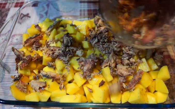 3. Отправляем в духовку на 30 минут при температуре 220 градусов. И вот вкуснейший ужин уже готов! Разве сможет кто-либо отказаться от такой выпечки? На первый взгляд вам может показаться, что это обычный пирог, но это не так. В нашем блюде много начинки и мало теста. Это не классический пирог. Здесь есть всё для сытного вкусного ужина: вкуснейшая запеченная картошка с лучком, пропитанная вкусной консервированной рыбой и всё это под румяной корочкой вместо хлеба. Как вам такая идея для семейного ужина из консервы и картошки?Видео рецепт ютуб ниже 👇