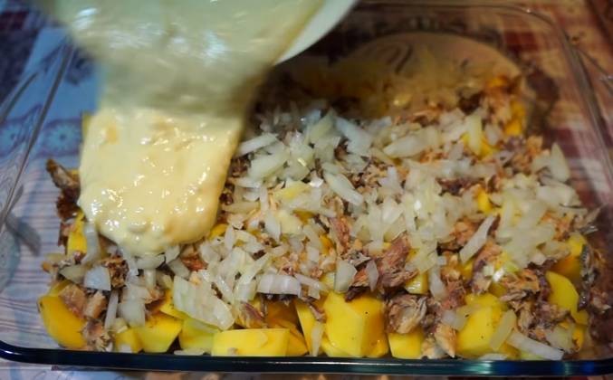 2.  Далее равномерно выкладываем на картошку всю рыбу. Теперь нам понадобится одна большая луковица. Если у вас лук маленький, можно взять несколько штук. Лук мелко нарежем. Весь нарезанный лук равномерно посыпаем на картошку с рыбой. Ну, вот мы уже почти всё подготовили, осталось дело за малым. В глубокую миску кладём 5 столовых ложек сметаны, 3 столовые ложки майонеза. Вбиваем 3 яйца. Добавляем пол чайной ложки соли и перемешиваем. Затем сюда же добавляем 1 чайную ложку разрыхлителя и 150 грамм муки. Снова всё хорошо перемешиваем. Осталось только выложить всё тесто на картошку с рыбой. Выкладываем и равномерно распределяем лопаточкой по всей поверхности.