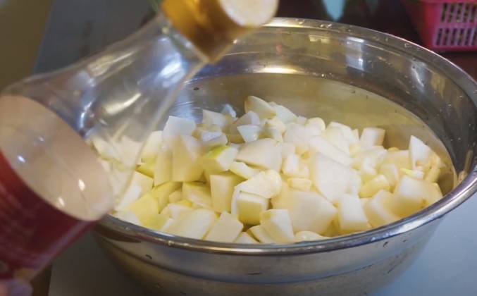 3. Разрезаем капусту до середины отрезаем кончик кочерыжки ещё раз разрезаем до середины хорошо промываем листя даём воде немного стечь в воду добавляем соль и хорошо растворяем обмакнуть капусту в солёной воде хорошенько просаливаем каждый слой капусты перекладываем в глубокую ёмкость оставляем на 5 часов или на ночь нарезаем половину от всего количества редьки на тонкие полоски добавляем сахар нарезаем оставшуюся редьку на куски нарезаем имбирь нарезаем репчатый лук очищаем и нарезаем грушу добавляем чеснок добавляем рыбный соус добавляем "меширэг" (мёд или сахар).