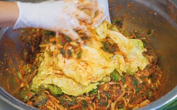 4. Всё хорошо пробиваем блендером в редьку добавляем красный острый перец хорошо перемешиваем хорошо промоем капусту от соли разделяем куски ещё пополам по разрезу нарезаем зелёный лук небольшими кусочками нарезаем горничные листы смешиваем зелень с редькой добавляем овощное пюре и тщательно перемешиваем попробуйте кимчи если вам кажется что перца не достаточно добавьте ещё уже в свежим виде очень вкусно промазываем соусом каждый слой капусты абсолютно каждый лист укладываем в ёмкость оставляем при комнатной температуре на 5~7 дней после чего убираем в холодильник ещё на пару недель.Видео рецепт ютуб ниже 👇