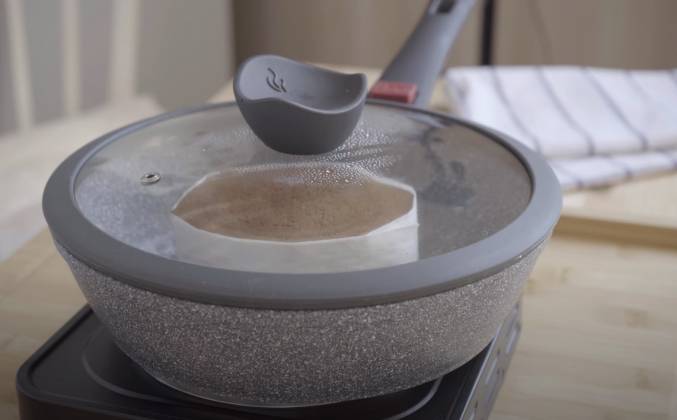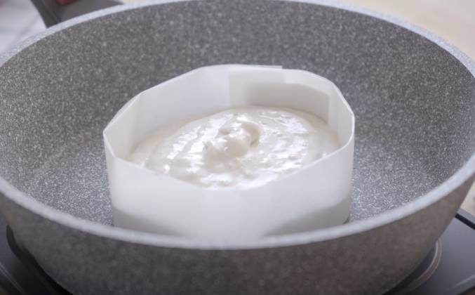 2. У меня бумага для выпечки тонкая, поэтому я взяла полоску 36 см Х 8 см и сложила её пополам. Если у вас плотная бумага для выпечки, возьмите полоску 36см на 4см сверните и скрепите её. Должен получится круг диаметром примерно 11 см. Небольшим количеством растительного масла я протёрла дно сковородки при помощи салфетки. Немного воды по краям сковородки я добавляю что-бы прогреть оладьи горячим паром. Добавляю воду раза два-три в процессе приготовления.