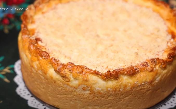 4. Взобьем одно куриное яйцо и сверху смажем наш пирог. Сверху выложим только что приготовленную смесь из муки, масла и сахара. Уберем в разогретую духовку и выпекаем около 30 минут при температуре 200 градусов по Цельсию. Пирог готов.