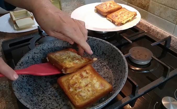 2. Из 6 кусочков хлеба для тостов вырезать мякиш. Налить подсолнечное масло. Выложить на сковороду хлеб для тостов без мякиша.Видео рецепт ютуб ниже 👇