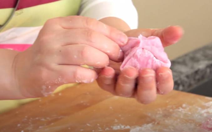 3. Я расстелила пищевую пленку. Мы собираемся сделать шестнадцать шариков. Шестнадцать штук одинакового размер. Далее отмеряем три четверти стакана воды. Одна чашка сладкой рисовой муки. Четверть чайной ложки соли. И добавьте одну столовую ложку сахара. Немножко красного пищевого красителя. Размешайте это хорошо, пока пищевой краситель не растворится. Какой красивый розовый цвет. Так, перемешали хорошо. Закройте это пленкой. Но не забудьте оставить зазор, чтобы пар выходил и не конденсировался. Три минуты в микроволновке при высокой температуре. Готовим. Спустя три минуты... ничего себе. Так горячо!