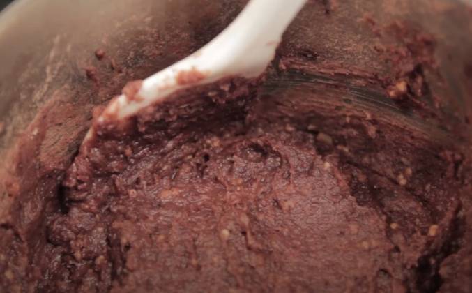 2. Здесь небольшое количество, так что вы можете использовать любую деревянную ложку, как эта. Но я собираюсь использовать кухонный комбайн. Измельчать на протяжении одной минуты. Отлично. Оставляю все красную фасоль здесь. Три четверти чашки тростнякового сахара. Четверть чайной ложки соли. Одна чайная ложка ванили. Я собираюсь снова разогреть это, пока все это сахар не растает. Мешайте это хорошо на медленном огне. Я собираюсь добавить две столовые ложки рисового сиропа. Цвет немного темный и блестит. Ничего себе, мы сделали очень вкусную и сладкую начинку из фасоли. И так, снимаем с плиты. Мм. Ммм. Такое сладкое. Вкусно.
