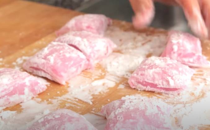 4. Внутри вы все еще видите белые комочки, так что это еще не приготовленное, поэтому я перемешаю тесто снова, где-то двадцать секунд. Закрываем. Готовим на протяжении еще одной минуты. Нужно месить энергично, благодаря этому, рисовый пирог будет более эластичным и легче жевать. Мешаем круговыми движениями, вот так: один два три И так сто раз. Хорошо, сделано. Я собираюсь посыпать разделочную доску крахмальным порошоком, чтобы рисовый тесто не прилипало к рукам. Поместите рисовое тесто на крахмал. [Намочите пальцы водой, чтобы легче было справляться с клейким рисовым тестом! :)] Я собираюсь перевернуть, [сделать хороший, плоский прямоугольник] [Разделить на 8 частей. ]