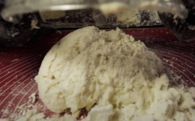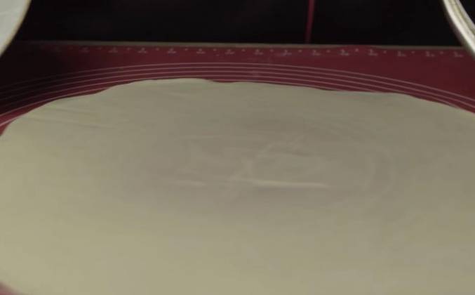 2. Замешиваем тесто, чтобы оно заварилось. Если к рукам не липнет, значит тесто годно замешано. Заворачиванием тесто в пленку. И оставляем его на 10 мину. Тесно должно быть эластичным, почти как Стретч Армстронг! Рвем или режем тесто на 6 кусков. Помнится, это было больно! Раскатываем на блины. Не менее 28 сантиметров в радиусе. Чтоб все завернулось. Вырезать круг ровно, поможет любая круглая утварь, острыми краями.