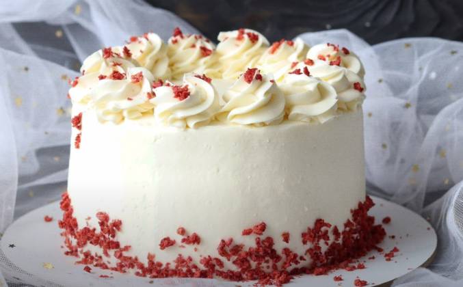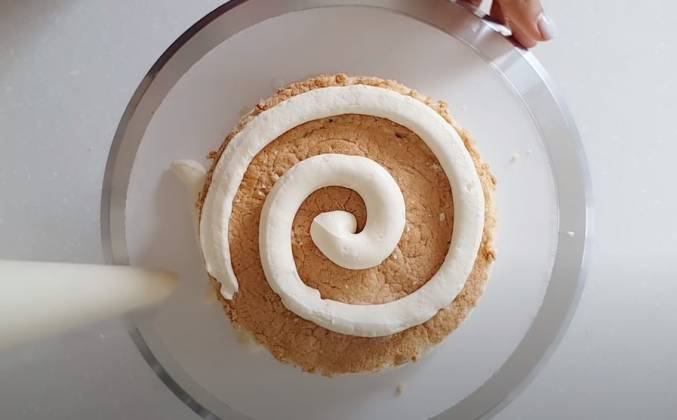 5. Собрать торт. Так как начинка нежная, то между слоями необходимо сделать дамбу (бортик) из кремчиза.