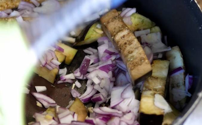 2. Чесночок нарезаем, как можно мельче, лук чистим и нарезаем кубиком. Баклажаны подрумянились, сюда же отправляем чеснок и лук. Помидорки разрезаем пополам и также отправляем их на сковородку. Кстати, уже сейчас можно сюда добавить немного соли и молотого перца. Ну и по сути нам осталось залить яичницу яйцами, которые я разобью в тарелочку и размешаю вилочкой до однородности.