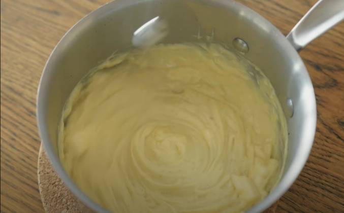 2. Становится крепче. Когда он укрепится, включите на слабый огонь и продолжайте нагревать еще 2 минуты. Обратите внимание, что заварной крем будет порошкообразным и не вкусным, если вы остановитесь на этом этапе. Если вы продолжите нагревание, крем будет мягче. Это сигнал о том, что мука была успешно разогрета. Добавить холодное масло и перемешайте, пока крем горячий Для эффективного охлаждения налейте его в миску, на которую наложена полиэтиленовая пленка. Запечатайте полиэтиленовой пленкой, чтобы избежать комков, когда высохнет.