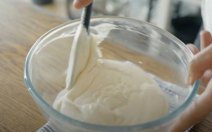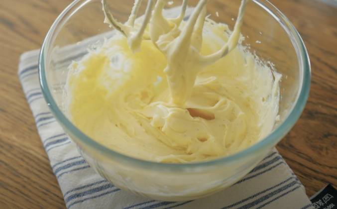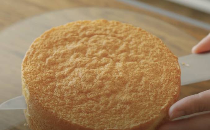 4. Просто 30 достаточно хорошо. Я не вырезал эту сцену, потому что некоторые люди считают, сколько раз смешивать… Добавьте растопленное масло и перемешайте его 15 раз. Эта форма для выпечки 15 см. Выровняйте поверхность. Я не использую тесто, прикрепленное к резиновому шпателю, потому что оно плохо надувается. Удалите из кастрюли, используя бутылку, как обычно, и охладите бисквит. Когда он остынет, разделите его на две части. Заварной крем становится очень твёрдым, когда его охлаждают. Смешайте его с помощью электрического взбивателя, пока он не приобретет гладкую и правильную твердость. Видите? Этот заварной крем выглядит вкусно, верно? Вам не нужно выравнивать поверхность. Размазывать ложкой можно, потому что она будет спрятана от бисквита.