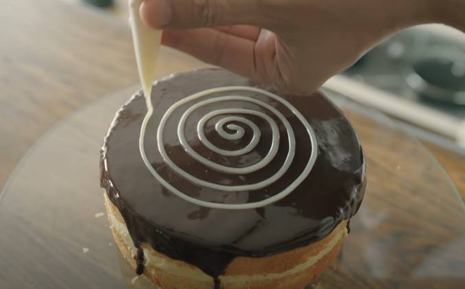 5. После этого я делаю шоколадный ганаш, чтобы закончить. В этом видео 7 г молока добавлено в 15 г шоколада, но оно было слишком мягким, поэтому я урегулировал его. Микроволновая печьег растопила, и ганаш завершен. Я буду использовать этот белый шоколад для украшения. Сделайте кондитерский пакет с пергаментной бумагой. Как этот) Налейте в пакет белый шоколад и закройте его. Затем срежьте кончик ножницами. Затем вы можете использовать это как шоколадную ручку. Нарисуйте общий образец бостонского кремового пирога. Сделайте рисунок, похожий на паутину, с вертелом и т.д. После небольшого охлаждения в холодильнике, все готово. Честно говоря, я сделал этот пирог впервые. И я никогда не ел раньше Но это сделано с заварным кремом, шоколадом и бисквитом, поэтому должно быть вкусно.