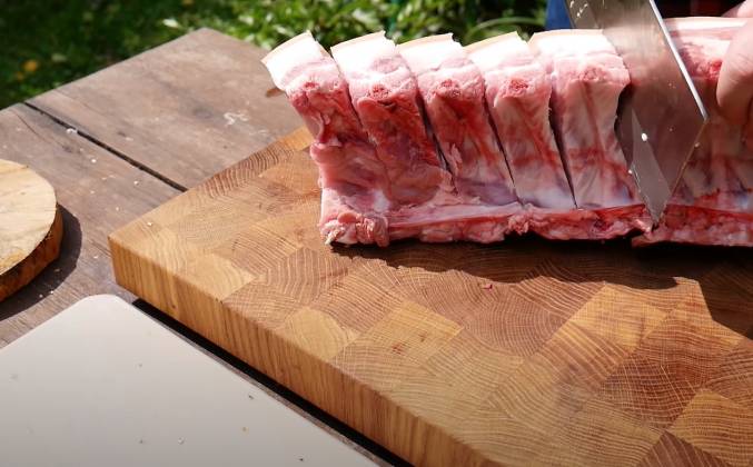 3. И завтра будем разжигать костер и жарить. Свинина промариновалась. Пора разжигать костер. Пора и мясо насаживать. Шикарно промариновалось и просолилось. Надевать конечно такие куски нужно вдоль кости. Знатный меч для настоящего рыцаря. Тоже самое проделываем со вторым шампуром. Ну что, отправляемся жарить? Вообще не замороченный шашлычок. Периодически переворачиваем и жарим до полной готовности. Вот это мясо! Можно снимать. Хороший кусок. Настоящим воинам отсутствие шампуров не помеха. Давайте снимем и попробуем. Видео рецепт ютуб ниже 👇