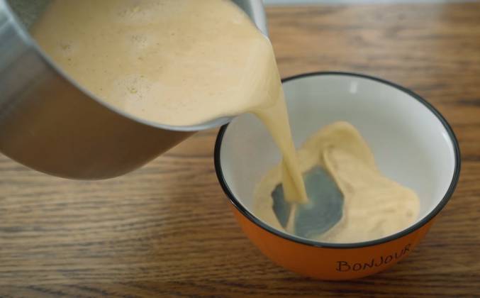 3. Пузырьки являются помехой для пудинга, поэтому избегаем пены. Добавляем ваниль. Нагреваем молоко для повышения температуры пудинга. Нагреваем до 80 С без закипания. Добавляем молоко постепенно,помешивая. После этого, температура должна достигнуть 50 С. Будьте уверены, что яйца не застыли при 50 С. Процедите и вылейте в контейнер. Если образовалась пена, удерите ее ложкой. Поместите миску в кастрюльку и закройте крышкой. Выключите огонь и ждите 40 минут. Встряхните, что бы увидеть, загустел ли он. Если не загустел, включите огонь,доведите воду до 80 С, накройте крышкой и ждите 15 минут. Достаньте пудинг и дайте охладиться ему.