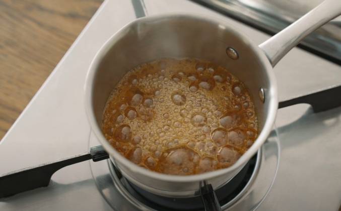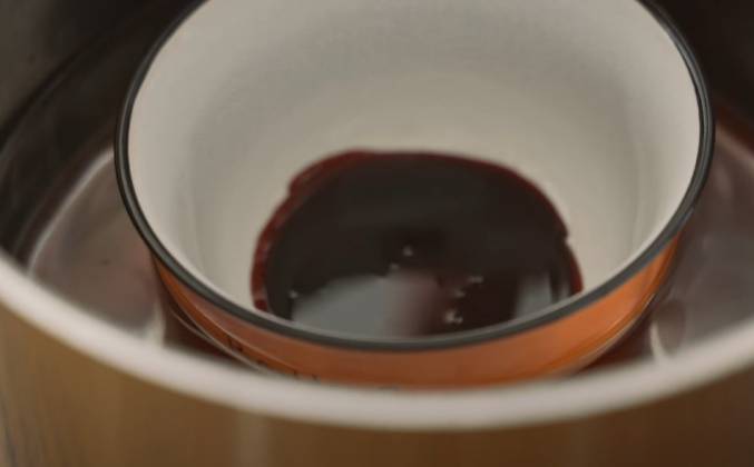 2. Выключите на этом моменте огонь и ждите. Карамелизация продолжится, даже если огонь выключен. Когда карамель издаст приятный аромат и потемнеет, добавьте воду, что бы понизить температуру. Будьте аккуратны, когда готовите карамель, во избежание ожогов. Карамель выглядит достаточно тёмной, но в этом и секрет этого пудинга. Добавьте достаточно воды в кастрюльку, но так, что бы миска не дотрагивалась до неё. Уровень воды таков, что палец не дотрагивается, когда Вы вынимаете чашу. Вода должна закипеть. Используйте яйца комнатной температуры. Если жидкость пудинга холодная, это займёт больше времени для застывания, особенно в центре. Яйца не взбиваем, просто размешиваем.