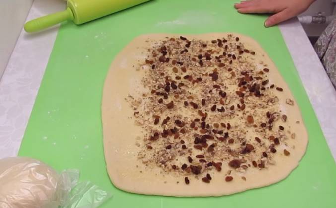 3. Теперь рабочую поверхность припыляем мукой и выкладываю на нее тесто. И теперь подсыпая совсем понемногу муку буду месить тесто на столе примерно 5-7 минут. Много муки старайтесь не сыпать, тесто у вас должна остаться очень мягкое и приятное. Теперь я его по делю на две части примерно. Одну часть пока отставлю в сторону, а эту нужно раскатать в прямоугольник. Обязательно, если вам нужно, то подсыпайте муку чтобы тесто не липло и хорошо раскатывалось. Вот, примерно, вот так у вас должно получиться. Толщина где-то 4-5 миллиметров. Теперь берем сливочное масло и хорошо смазываем всю поверхность. Прямо лить сливочное масло не нужно, чтобы у вас все не плавала - просто смазали и этого достаточно. Сверху присыпаем сахаром, измельченными орехами и изюм. Обратите внимание, что начинка с этого края не до самого конца чтобы было удобно завернуть.