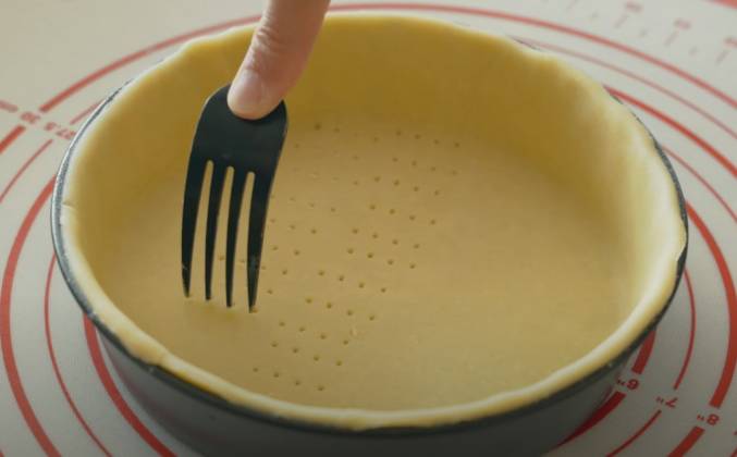2. Таким образом замесите тесто, чтобы не было комков масла. Поскольку тесто мягкое, охладите его в холодильнике в течение 1-2 часов. Сначала посыпьте мукой и раскатайте тесто вручную. Используйте хлопковую скалку, чтобы удлинить ее до 30 см. На самом деле, для этого десерта есть плесень, но вместо этого я буду использовать плесень размером 18 см. Разложите тесто, чтобы воздух не попал внутрь. Сделайте отверстия вилкой, чтобы она не разбухала. Когда закончите, охладите это в холодильнике. Этот чизкейк выпекается при очень высокой температуре.