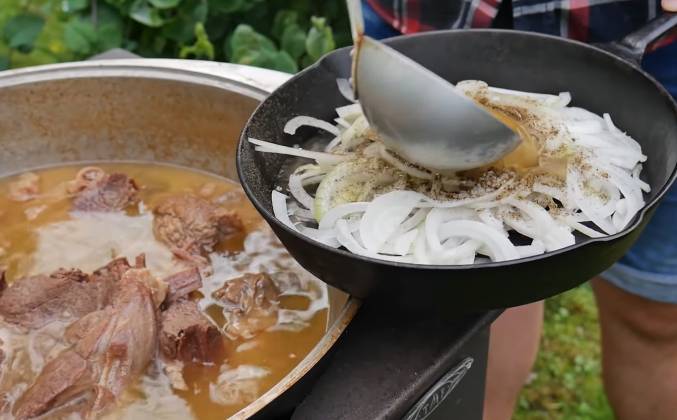 3.  Оно полежит еще полчасика, отдохнет и станет еще более податливым и будет легко катать, для того, чтобы у вас получилась тоненькая и вкусная лапша. И еще одна неотъемлемая часть бешбармака, это соус из репчатого лука, томленого в жиру, который выделяется во время варки мяса, с большим количеством молотого черного перца. Нужно тоненько порезать лук. Немного соли и черный перец и аккуратно цепляем жирную часть бульона. И довести до кипения и прогреть 2 минут. Ну а нам пора вытаскивать разваренную конину и дать ей остыть. Вы только посмотрите, какое мягкое мясо. Все что нам остается, это раскатать лапшу, сварить ее в оставшемся бульоне и разобрать мясо и можно подавать бешбармак. С тестом для лапши все просто - присыпали мукой, выкладываем тесто, еще немного присыпаем его мукой, чтобы ничего не прилипало.