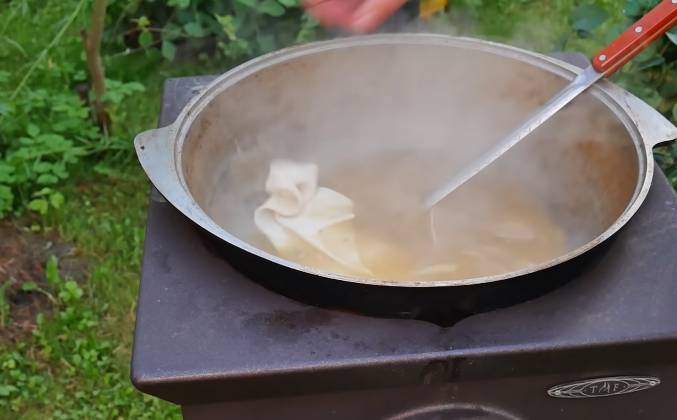 2.  Прошло два часа, давайте откроем. Несмотря на то, что запах стоит невероятный, конское мясо еще далеко не настолько мягкое как нам нужно. Тем не менее, я уже могу зачерпнуть немножко бульона, чтобы он остывал. На нем мы будем замешивать лапшу для нашего бешбармака. Так лапша будет намного вкуснее. Бульон остынет и будем замешивать. Ну а теперь самое интересное, будем готовить лапшу для бешбармака. Здесь все просто: 500 грамм муки пшеничной, щепотка соли, 1 яйцо, а бульон уже добавляем по консистенции. Муку, соль и одно яйцо. Бульон у нас уже жирный, поэтому растительное масло можно не добавлять. И начинаем замешивать рукой, как только тесто становится плотным, перекладываем его на стол и вымешиваем на доске. Вот так вот. Такое мягкое эластичное тесто, которое не липнет к рукам, у вас должно получиться.