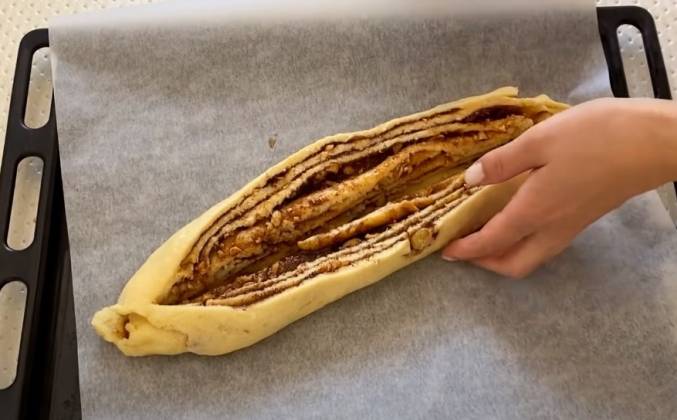 3. Для начинки добавим корицу, сахар и арахис. В принципе, достаточно корицы с сахаром. Но с орехами будет вкуснее. Все хорошо перемешиваем. И распределяем сверху растопленного масла. Тесто медленно закручиваем, как рулет. Под рулет постелила пергаментную бумагу. Заранее разогрейте духовку до 180 градусов.