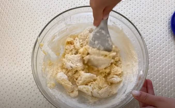 2. Затем понемногу кладем муку с разрыхлителем. Замешиваем тесто. Всю муку сразу не кладите. Надо понемногу. Помешивайте до однородной массы. Нельзя класть лишнюю муку, иначе наше тесто будет твердым. У нас получилось вот такое тесто. К рукам сильно не прилипает. Теперь, стол обсыпаем мукой и тонко раскатываем тесто. Сверху смазываем растопленным сливочным маслом. Все составы ингредиентов написала в описании под видео.