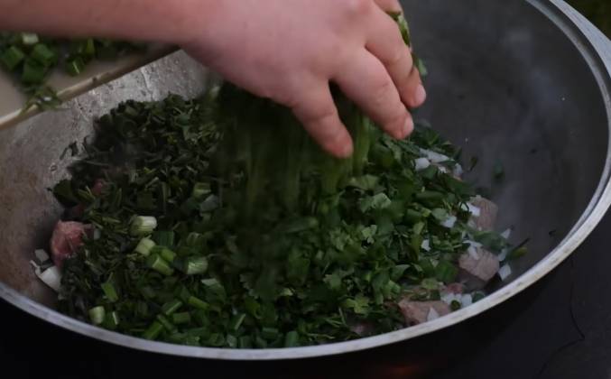2.  А если говорить о зелени, то главная зелень в чакапули это тархун или эстрагон, как его еще называют. Помимо этого зеленый лук, кинза, петрушка. Ну кинзу можете убрать,если не любите. Все это дело мелко рубят. Красавчик эстрагон. Я говорил много зелени - я имел ввиду действительно много зелени. Теперь можно переходить непосредственно к приготовлению чакапули. Обычно все продукты закладываются в холодный казан. Мне нравится немножко обжарить мясо, поэтому идем к нашей печи. Обжаривание буду на сливочном масле. Можно лепешку греть. И закладываем обжариваться баранину. Баранину сильно зажаривать не нужно, потому что чакапули это прежде всего тушеное мясо с зеленью. И следующим этапом закладываем репчатый лук, равномерно распределяю его по всей поверхности и засыпаем зеленью.
