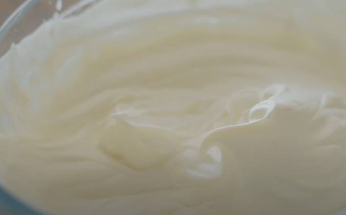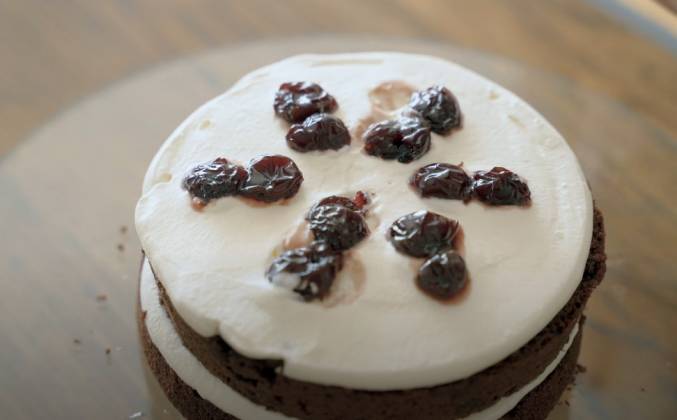 3. Жирные сливки лучше взбивать, когда они холодные. Взбейте сливки лучше, чтобы бисквит не соскальзывал. Бисквит суховатый, поэтому я полью его сиропом. Возьмите треть взбитых сливок. Можете также использовать ложку или резиновую лопаточку. Шварцвальдский торт состоит из шоколада и вишни.