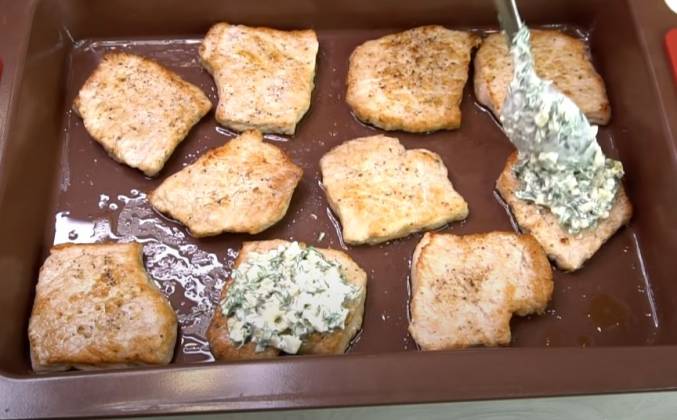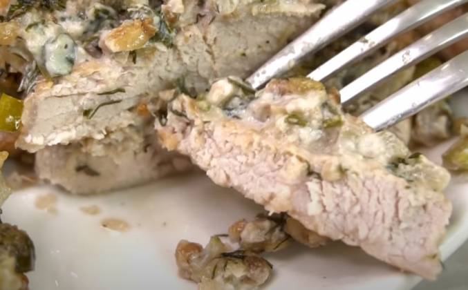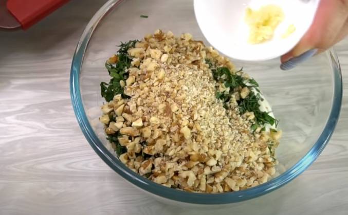 3. В миску кладем 3 ст.л. майонеза или сметаны, можно в равных пропорциях. Добавляем огурцы, зелень укропа и петрушки мелко порубим, грецкие орешки 50 грамм порубим ножом. И добавляем 2 зубчика чеснока, все перемешиваем, соус должен получится достаточно густой. Кладем на мясо, можно посыпать тертым сыром по желанию. Ставим в разогретую духовку и готовим 20-30 при 220 градусах, все зависит от размера порционных кусочков.Видео рецепт ютуб ниже 👇