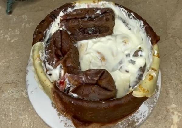 5. Укладываем шоколадные рулеты вторым слоем. Смазываем сверху кремом. Перекрываем верх блинами, как показано на видео. Сверху накрываем пищевой пленкой и убираем в холодильник минимум на 5 часов, а лучше на всю ночь.Видео рецепт ниже 👇