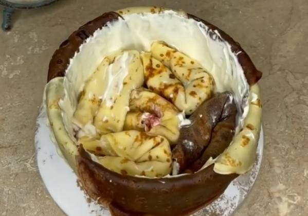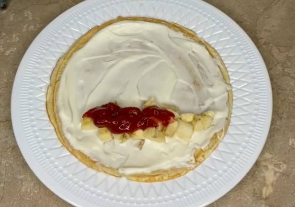 4. Дно перекрываем блином. Покрываем все изнутри кремом. ⠀ Делаем первый слой. Каждый светлый блин смазываем кремом. Выкладываем бананы и клубничную начинку. Заворачиваем в рулет. Рулеты укладываем во внутрь формы. Первый слой рулетов смазываем кремом. Все тоже самое делаем с шоколадными блинами.