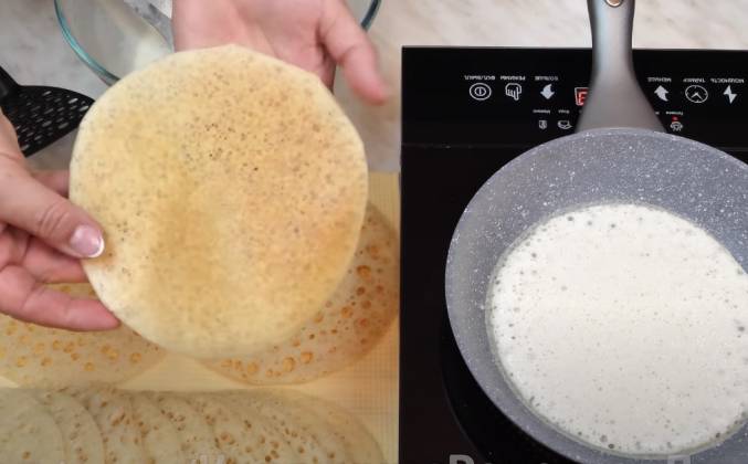 3. Блинчик считается готовым, если на поверхности не останется сырого теста, а донышко будет слегка золотистого цвета. Заранее подготовьте кувшин с очень холодной водой для охлаждения сковороды и какую-нибудь емкость, куда ее можно сливать. Дело в том, что это тесто надо наливать на холодную или слегка теплую сковороду только так, плавно и медленно нагреваясь, оно в результате получается таким пористым, губчатым, со множеством дырочек. Если у вас две сковороды, просто меняйте их местами, пока на одной печете, вторая остывает, а еще после выпекания каждого блина горячую сковородку можно погрузить на несколько секунд под струю холодной воды. Итак, горячую сковородку охлаждаем, наливаем порцию теста в центр сухой сковороды, даем ему растечься и на слабом нагреве печем до готовности. Горячие блинчики в один слой раскладываем на полотенце до полного остывания, а только потом укладываем их стопкой друг на друга.Видео рецепт ютуб ниже 👇