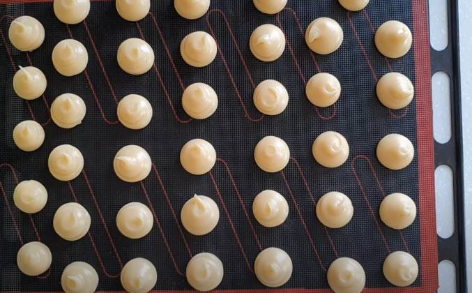2. Влить порциями яйца и каждый раз хорошо смешивать до однородности. Готовое тесто должно медленно стекать с лопатки ровным треугольником. Переложить тесто в кондитерский мешок. Отсадить на перфорированный коврик. Поставить профитроли в духовку, разогретую до 190 градусов и сразу снизить до 170. Выпекать при температуре 170 градусов 20 минут, затем снизить до 160 градусов и сушить еще 30 минут.