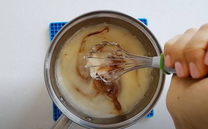 3. Крем. Смешать яйцо, крахмал и сахар. Молоко довести до кипения и влить тонкой струйкой в яичную смесь. Вернуть массу в сотейник и варить на медленном огне, при постоянном помешивании. Как только масса начала густеть и появились первые пузыри, снять с огня. Заварной крем остудить до комнатной температуры, затем добавить пралине и хорошо перемешать.
