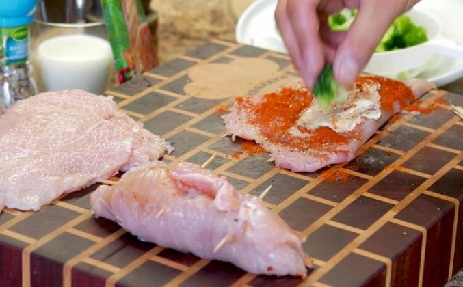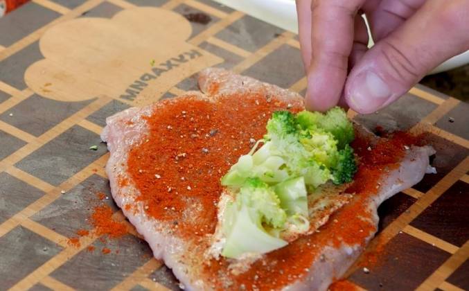 2. Вода закипела, немножко подсолим ее и закинем вариться брокколи буквально минут на 5. Ну, а пока у нас отваривается брокколи, мы уже можем начать готовить первый кусочек куриного филе для свертывания его в рулет. Его необходимо посолить, хорошенько присыпать молотой паприкой. Паприка идеально сочетается с курицей, и ее можно не жалеть. Немного молотого перца. Ну и сюда же намазываем плавленого сыра чуть-чуть, буквально 10-15 г. Брокколи проварилась минут 5, откидываем ее на дуршлачок и дадим стечь лишней воде. На сыр выкладываем брокколи. Ну и сейчас все это дело необходимо завернуть в рулетик. Это самый ответственный момент. Ну, а для того, чтобы все скрепить, будем использовать обычные зубочистки. Подворачиваем концы вовнутрь, чтобы ничего не выпирало. Первый рулетик готов. Ну и вроде даже не комом. Ну и по такому же принципу заворачиваем остальные 3 штуки. Немного брокколи у нас даже осталось, поэтому в рецепте можно брать 100 г. Ну, а рулетики готовы. Конечно, каждый из них уникален по-своему, какие-то получились симпатичные, какие-то истыканные зубочистками. Но по факту, когда все приготовится, они должны хорошо держать форму.