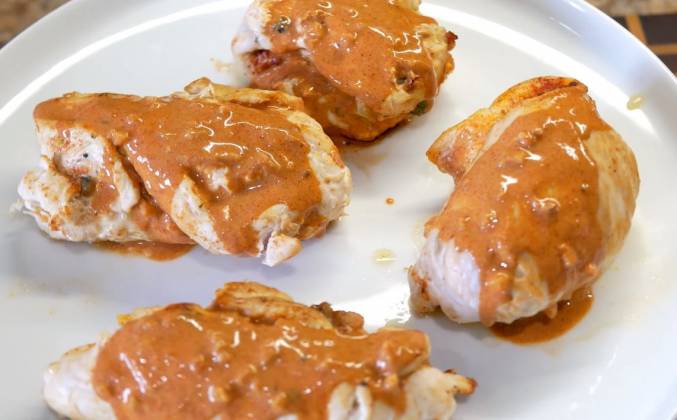 3. Готовить рулетики мы будем в духовке, поэтому уже сейчас можно поставить разогреваться ее до 200С. Но сперва мы немножко обжарим их на разогретой сковородке, буквально по 1 минутке с каждой стороны. Курочка подрумянилась с 2-х сторон. Красотища! Перекладываем все это дело в форму и доготавливаем в духовке буквально 15 минут. Ну, а пока доготавливается курица, у нас есть время, чтобы приготовить соус. Вливаем молоко в ту же самую сковородку, где готовили курочку, ставим все это дело на небольшой огонь, добавляем сюда молотую копченую паприку. Она придаст соусу и цвет, и пикантный аромат копчености. Ну, а также добавим туда измельченный зубчик чеснока. Соус мы будем томить на небольшом огне, пока он не загустеет. Соус необходимо постоянно помешивать, чтобы молоко у нас не пригорело. Соус загустел, можно выключать огонь. Перельем его сейчас в стаканчик, чтобы он не прилип к сковородке. Ну, а потом польем готовое блюдо. 15 минут прошло, перекладываем рулетики на тарелку. Далее мы снимем шпажки и польем все это дело соусом. Куриные рулетики готовы!Видео рецепт ютуб ниже 👇