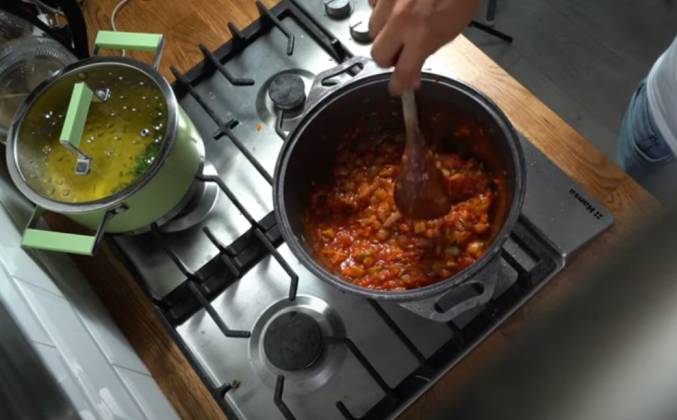 2. Чесночок и томатная паста. Все хорошо перемешиваем, и на среднем огне под крышкой это еще будет томиться около 40 минут. После чего добавим специи. Здесь икра у нас уже полностью готова. Давайте теперь добавим чайную ложку, даже две чайные ложки соли, 1 чайную ложку сахара. Здесь все по вкусу, ребята. Черный перец или смесь перцев, как вам больше нравится. И добавим чайную ложку или полторы яблочного уксуса. Вот так.