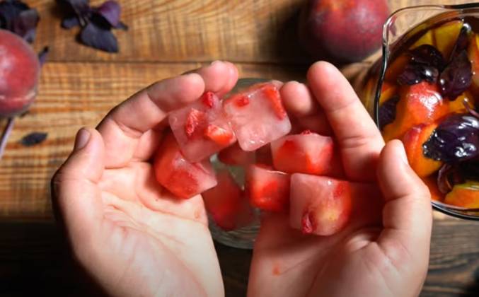 3. А также очень рекомендую добавить свежие листья базилика. Да, вы не ослышались, базилика. Немного колотого льда. Хотя можно и много, никто не запретит насыпать целую кучу. Также как и сироп будущую сладость и насыщенность вкуса чая вы можете регулировать количеством сиропа. Рекомендую хорошенько все перемешать и чай готов. Обратите внимание, как красиво можно подавать холодный персиковый чай. Это замороженные кубики с клубникой. Наполняйте бокал. Угощайте друзей, наслаждаетесь сами. Приятного вам аппетита.Видео рецепт ютуб ниже 👇