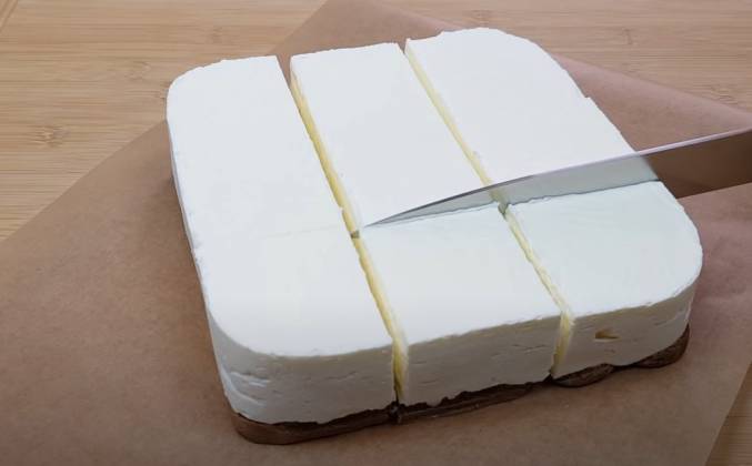 4.  Положила для того, чтобы торт был ровным. Убираем мороженое в морозильную камеру до полного застывания, примерно на 5 часов. Время замораживания зависит силы Вашей морозильной камеры. Готовое мороженное освобождаем от формы и пергаментной бумаги. Перекладываем на доску и убираем ленту. Сухим, тёплым ножом нарезаем на порционные кусочки. Чтобы торт было удобнее разрезать, его надо достать из морозильной камеры за ранее. Примерно за 10 - 20 минут, до подачи на стол. В зависимости от того, какая у вас температура в помещении. 5.  Сверху торт посыпаем просеянным какао. Перекладываем на тарелку и подаём к столу. Большим плюсом данного торта-мороженого Тирамису является то, что его можно приготовить заранее, и в любой момент побаловать вкусным десертом себя и своих близких. Если вам понравился рецепт, тогда делитесь этим видео с друзьями, ставьте лайки, пишите комментарии. Подписывайтесь на мой канал, смотрите мои другие видео, мне будет очень приятно. Желаю вам приятного аппетита и отличного настроения!