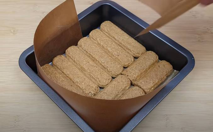 1.  Заварим крепкий кофе. Я в 30 мл кипятка всыпаю 2,5 ч. ложки растворимого кофе. Если вы любитель сладкого, то можно добавить в кофе сахар. Вливаем в кофе, 50 мл сливок жирностью 30-35% Перемешиваем. Это будет пропитка для печенья. Переливаем пропитку в тарелку и подготовим основу для торта. Я готовлю торт в форме размером 18 на 18 см. Чтобы торт было удобнее вынуть из формы, дно формы застилаю пергаментной бумагой. Для основы мы будем использовать бисквитное печенье Савоярди. Пропитываем печенье в пропитке Даём пропитке стечь И выкладываем в 1 ряд на дно формы.