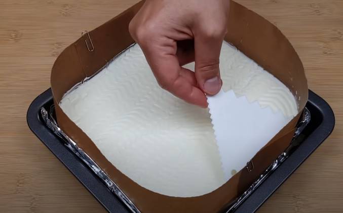 2.  Для того, чтобы торт было удобнее вынуть из формы, я края закрываю тефлоновой лентой. Вместо тефлоновой ленты можно использовать ацетатную плёнку или пергаментную бумагу. Убираем основу в холодильник и приготовим сырное мороженое. В чистой, сухой, холодной чаше взобьём 250 граммов охлаждённых сливок жирностью 30-35% Начинаем взбивать на минимальных оборотах миксера. Когда сливки начинают пениться, постепенно увеличивая обороты миксера до максимальных взбиваем сливки до воздушного состояния. Взбиваем сливки до мягких пиков. К 200 граммам сливочного сыра. 3.  Маскарпоне добавляем 160 граммов сгущённого молока Если вы любители сладкого, то можно взять больше сгущённого молока, например 180 или 200 граммов Перемешиваем на небольших оборотах миксера до однородно состояния. Сырная масса должна стать однородной и воздушной в 2 этапа перекладываем сырную массу во взбитые сливки И на небольших оборотах миксера перемешиваем до однородного состояния. Сырное мороженое готово, перекладываем его на печенья и равномерно разравниваем. Так как моя форма немного большего размера, чем торт, я положила фольгу между лентой и формой.