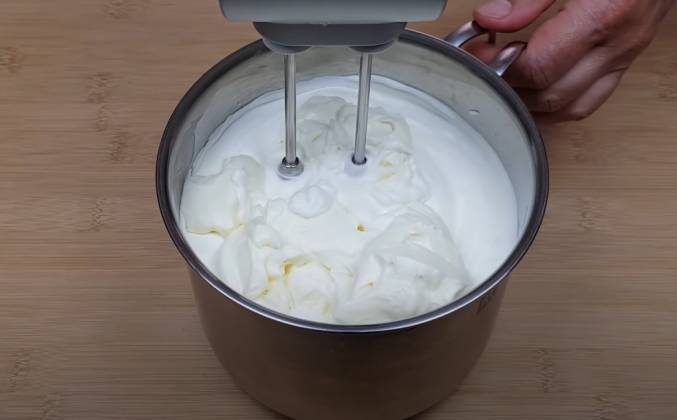 2.  Для того, чтобы торт было удобнее вынуть из формы, я края закрываю тефлоновой лентой. Вместо тефлоновой ленты можно использовать ацетатную плёнку или пергаментную бумагу. Убираем основу в холодильник и приготовим сырное мороженое. В чистой, сухой, холодной чаше взобьём 250 граммов охлаждённых сливок жирностью 30-35% Начинаем взбивать на минимальных оборотах миксера. Когда сливки начинают пениться, постепенно увеличивая обороты миксера до максимальных взбиваем сливки до воздушного состояния. Взбиваем сливки до мягких пиков. К 200 граммам сливочного сыра.