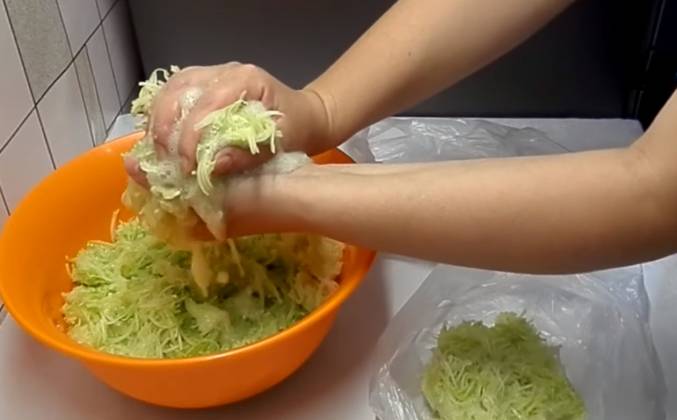 2. 2 способ - это заморозить кабачки на оладьи. И потом зимой баловать себя вкусными оладушками. Для этого способа подойдут даже старые кабачки. Видите какие они у меня большие. Нам нужно наши кабачки потереть на средней терке. Теперь когда кабачки потерты мы их берем, и слегка отжымаем. Чтобы сок немного остался. Слаживаем по пакетам, столько, сколько Вам нужно на один раз. Из кулька выпускаем лишний воздух. Хорошо завязать. И ставим в заморозку замораживаться, а зимой мы достаем, размораживаем в миске добавляем яйца, муку, все точто Вы добавляете летом. И жарите как обычно. У меня на канале есть рецепт, ссылку я оставлю под этим видео.