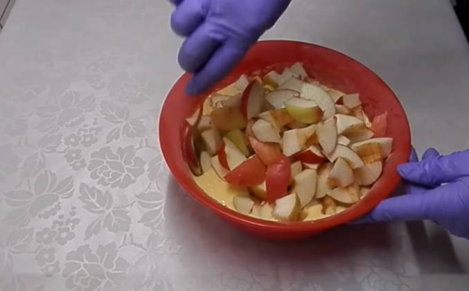 2. И все хорошо вымешиваем до однородного состояния на минимальной скорости. Все тесто готово. Оно должно быть вот такое жидкое - видите. Оно льется. Теперь мы берем наши яблоки и абсолютно произвольно режим в тесто мелкими и крупными кусками не имеет значения. И хорошо перемешиваем ложечкой или лопаточкой. Вам может показаться что здесь мало теста и очень много яблок не переживайте так и нужно.Это пирог тем и хорош что здесь мало теста и очень много яблок и за счет этого получается очень вкусный. Все наше тесто готово.