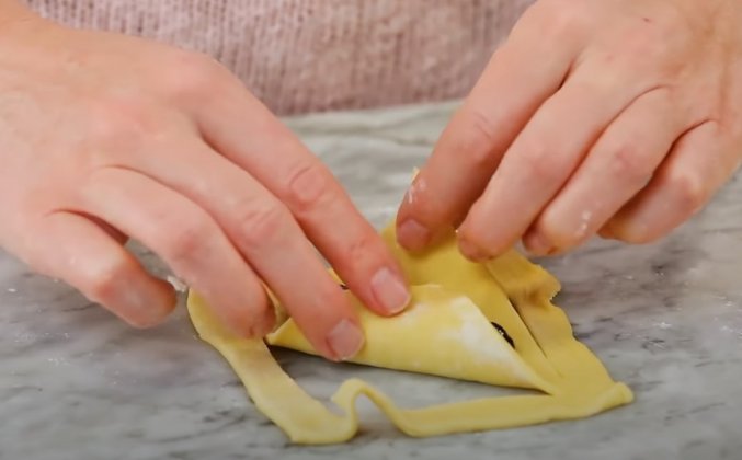 3.  Переложить тесто на противень. Повторяйте этот процесс, пока все квадраты не будут заполнены. Смажьте каждое тесто яйцом. Выпекайте выпечку, пока она не станет золотой, примерно от 17 до 20 минут. Подавайте их немедленно как есть или посыпьте сахарной пудрой.Видео рецепт ютуб ниже 👇