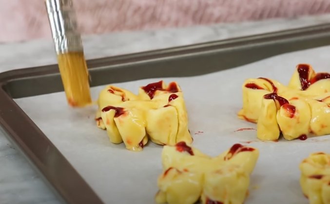 3.  Переложить тесто на противень. Повторяйте этот процесс, пока все квадраты теста не будут заполнены. Смажьте каждый цветок яйцом. Выпекайте выпечку, пока она не станет золотой, примерно от 17 до 20 минут. Подавайте их немедленно как есть или посыпьте сахарной пудрой.Видео рецепт ютуб ниже 👇
