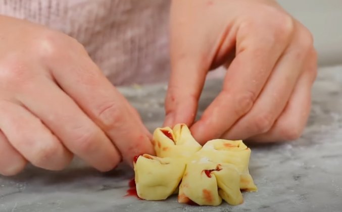 2.  Переверните узел так, чтобы гладкая сторона была обращена вверх. Разрежьте восемь надрезов вокруг, убедившись, что центр не поврежден. Возьмите два надрезанных кусочка теста и поверните их, чтобы обнажить содержимое. Сожмите концы вместе, чтобы сформировать лепесток. Повторяйте этот процесс, пока все лепестки не будут сформированы. 3.  Переложить тесто на противень. Повторяйте этот процесс, пока все квадраты теста не будут заполнены. Смажьте каждый цветок яйцом. Выпекайте выпечку, пока она не станет золотой, примерно от 17 до 20 минут. Подавайте их немедленно как есть или посыпьте сахарной пудрой.