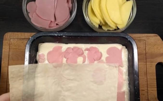 3. Форму я смазала сливочным маслом, кладу первый листик и поливаю его заливкой. Распределяю так, чтобы вот во все краешки заливка попала. Теперь выкладываю тонко нарезанную ветчину. Затем снова слой заливки. Теперь выкладываю сыр, тонко-тонко нарезанный. Затем, листик лаваша, заливка и так далее, пока не кончится продукты. Все слои сверху присыплю немножко сыром, для красивой корочки.
