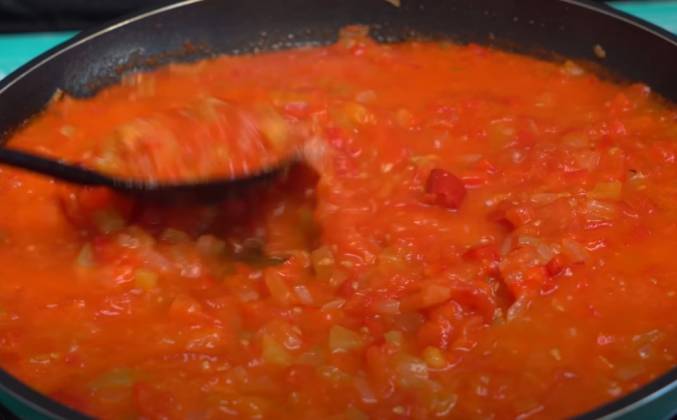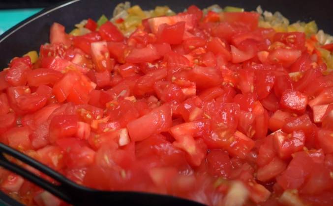 2. Когда он станет полупрозрачным, добавьте сладкий перец. Хорошенько перемешайте. Далее кладите помидоры. Все жарьте на сильном огне. Сначала блюдо будет похоже на соус. Но когда половина влаги уйдет, можно будет добавить чайную ложку соли. Для этого рецепта нужно, чтобы весь сок от помидор испарился. Перемешивая, постоянно проверяйте. По дну сковороды проведите ложкой, если жидкость быстро скапливается, то продолжайте жарить. Масса должна получится кашеобразной.